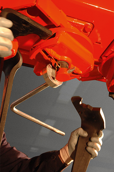Un perno integrato nel supporto porta coltelli, estraibile con un'apposita chiave in dotazione, consente di cambiare in pochi secondi i denti usurati, nella massima sicurezza.