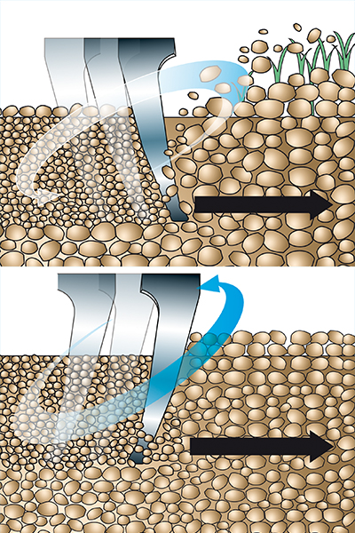 Robusti cunei avvitabili sono stati installati a protezione del rotore e della vasca di contenimento degli ingranaggi dalla collisione con sassi, rami o legacci che possono attorcigliarsi attorno agli alberi. I cunei possono essere rimossi facilmente quando si opera in terreni senza pietre e per migliorare il flusso del terreno.