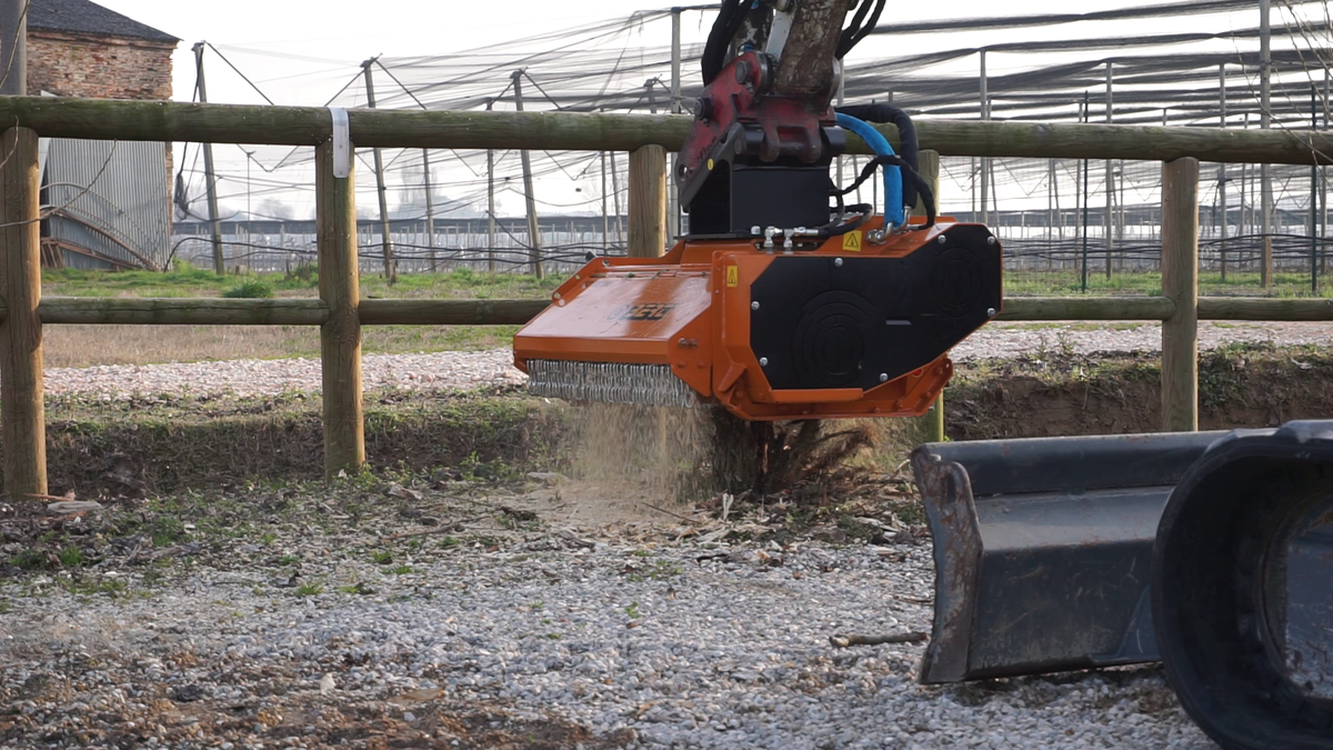 Trincia forestale con rotore a utensili fissi per escavatore con peso operativo compreso fra 50 e 70 quintali, adatta a trinciare erba, rovi ed arbusti fino a Ø 7-8 cm. |