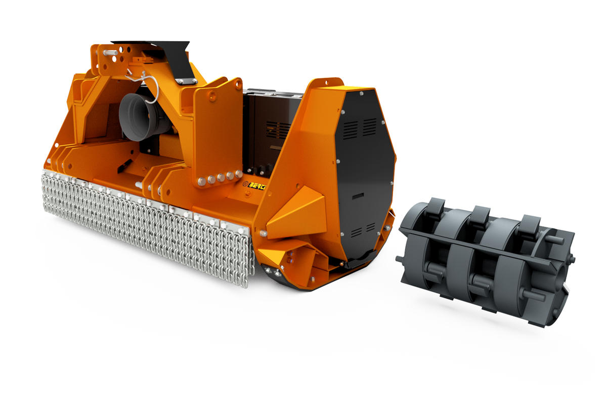 Trincia forestale Berti con **doppia trasmissione**, equipaggiata con **rotore con mazze a scomparsa**, adatta a triturare **vegetazione incolta, ramaglia e tronchi fino a Ø 30 cm**. Da applicare a trattori da **110 a 200 HP**. |