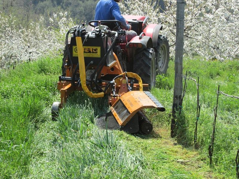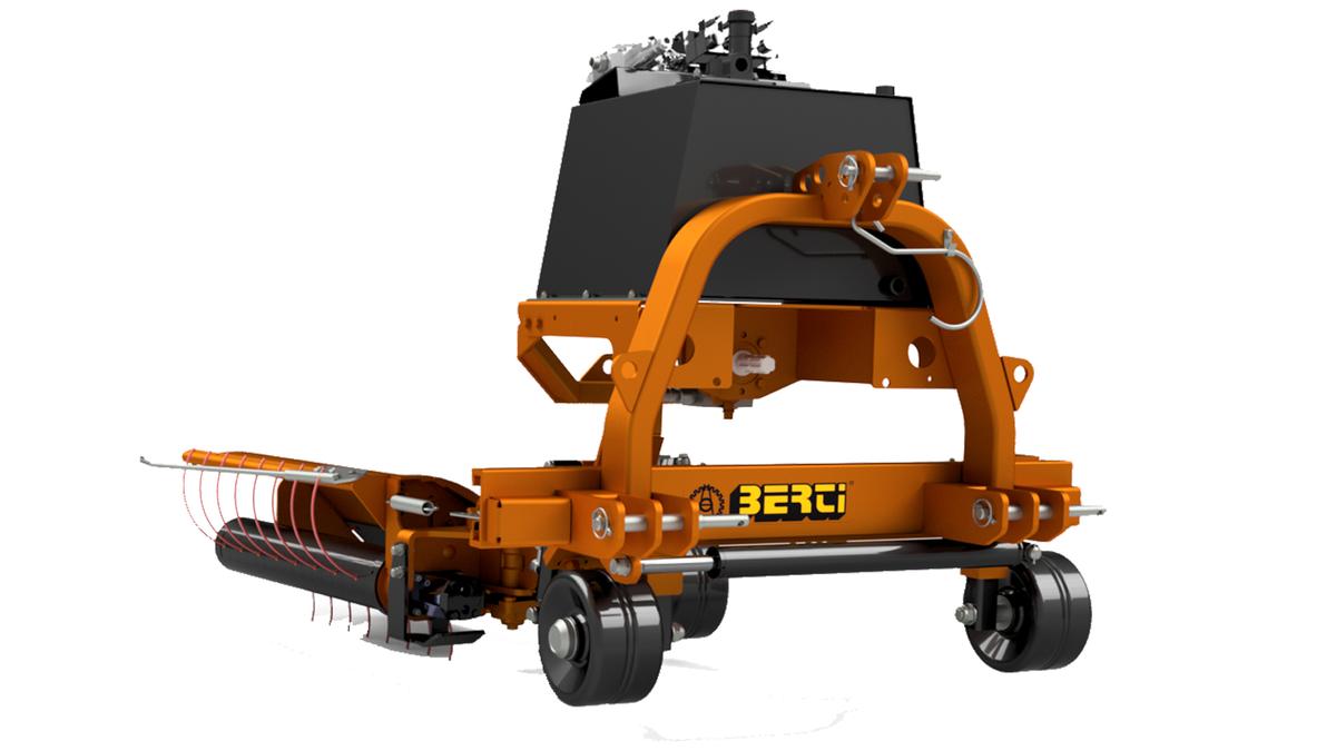 Diserbatrice idraulica interfilare. Idonea per lo sfalcio dell'erba sottofila su vigneti e frutteti in generale. Questo modello è dotato di un telaio portante con tre regolazioni idrauliche, traslazione, inclinazione ed alzata, dispone di un serbatoio indipendente e di doppie pompe, la prima agisce sul motore idraulico del rotore, la seconda opera sui servizi della macchina. La decespugliatrice è costituita da un rotore a fili, disposto parallelamente al terreno; durante la fase di lavoro i fili in nylon posti sul rotore per effetto della forza centrifuga aggrediscono le erbe infestanti distruggendole senza arrecare il minimo danno al fusto delle piante. Il rotore (brevettato) è composto da 16 bobine singole che permettono la sostituzione dei fili con estrema facilità e rapidità. Il carter di protezione è stato creato con la possibilità di regolazione meccanica in ogni direzione (altezza, profondità ed inclinazione), garantendo la massima flessibilità ad ogni tipo di impiego. |