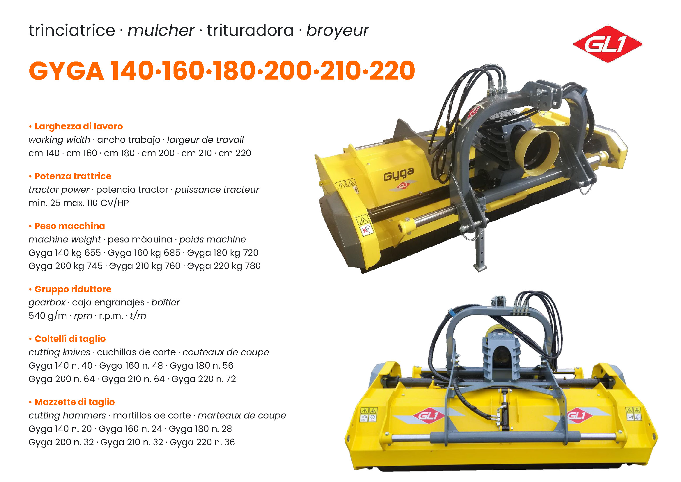 Trattori con potenza da/a: 25 ÷ 110 CV Larghezza di taglio: 140 – 220 CM Peso: 655 – 780 KG |