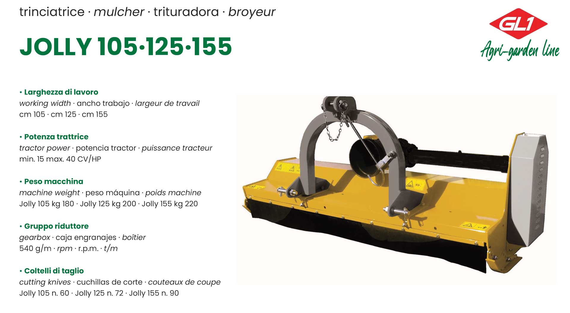 Trattori con potenza da/a: 15 ÷ 40 CV Larghezza di taglio: 105 cm · 125 cm · 155 cm Peso: 180 – 200 – 220 KG Coltelli di taglio: