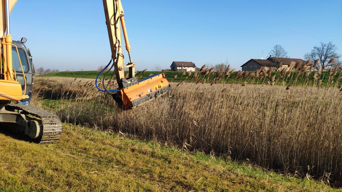 Trincia per escavatore con peso operativo da 120 a 200 quintali, adatta ad eseguire lavori di decespugliazione su erba, canneto, rovi ed arbusti fino a Ø 10-12 cm. Equippaggiata con motore a pistoni a cilindrata variabile automatica.