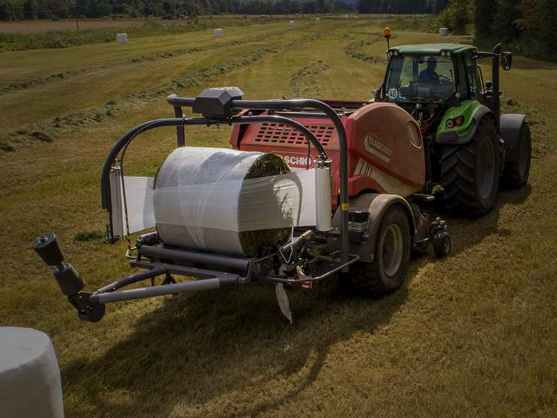 Il fasciatore è costituito da una piattaforma a 3 rulli, 2 bobinatrici per film da 75 cm e taglia film automatico. I 3 rulli motorizzati permettono una rotazione continua e regolare. Uno specifico sensore controlla eventuali rotture del film plastico, andando a compensare i giri di film mancanti dell’altro braccio. Una volta fasciata, la balla viene espulsa e lasciata a terra oppure può essere ribaltata.