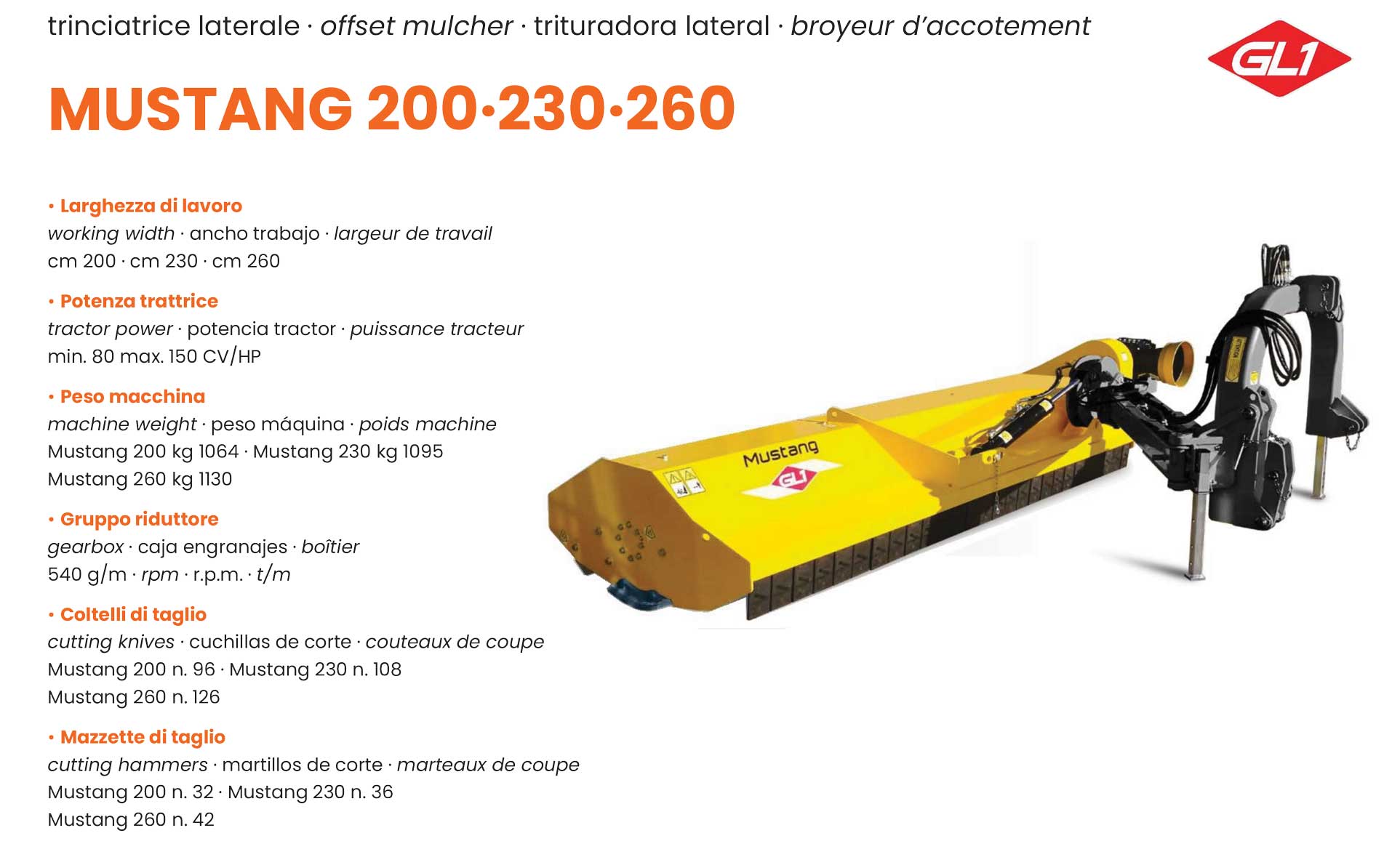 Trattori con potenza da/a: 80 ÷ 180 CV Larghezza di taglio: 200 – 230 – 260 CM Peso: 1064 – 1095 – 1130 KG |
