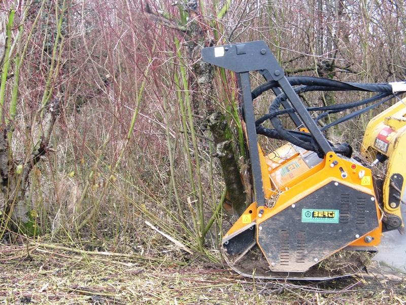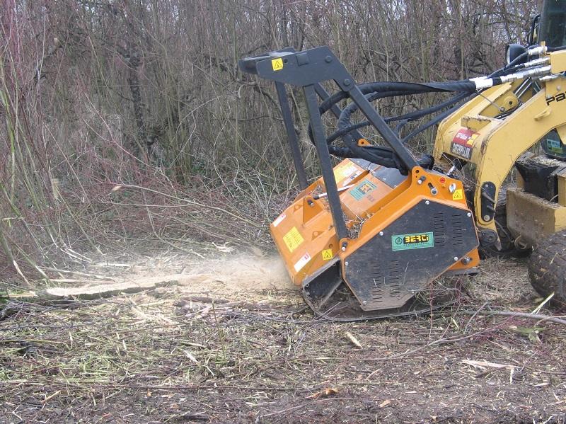 Trincia forestale idraulica con rotore a utensili fissi per erba, cespugli e sarmenti e rovi fino a Ø 20 cm. Si applica a minipale da 70 a 120 HP. |