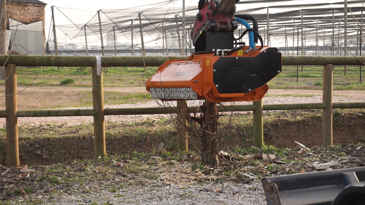 TRINCIA PER ESCAVATORE Trincia forestale con rotore a utensili fissi per escavatore con peso operativo compreso fra 50 e 70 quintali, adatta a trinciare erba, rovi ed arbusti fino a Ø 7-8 cm. Equippaggiata con motore a pistoni a cilindrata variabile automatica.