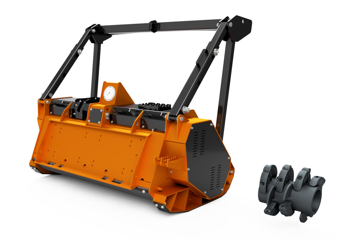 Trincia forestale idraulica con rotore a utensili fissi per erba, cespugli e sarmenti e rovi fino a Ø 20 cm. Si applica a minipale da 70 a 120 HP. |