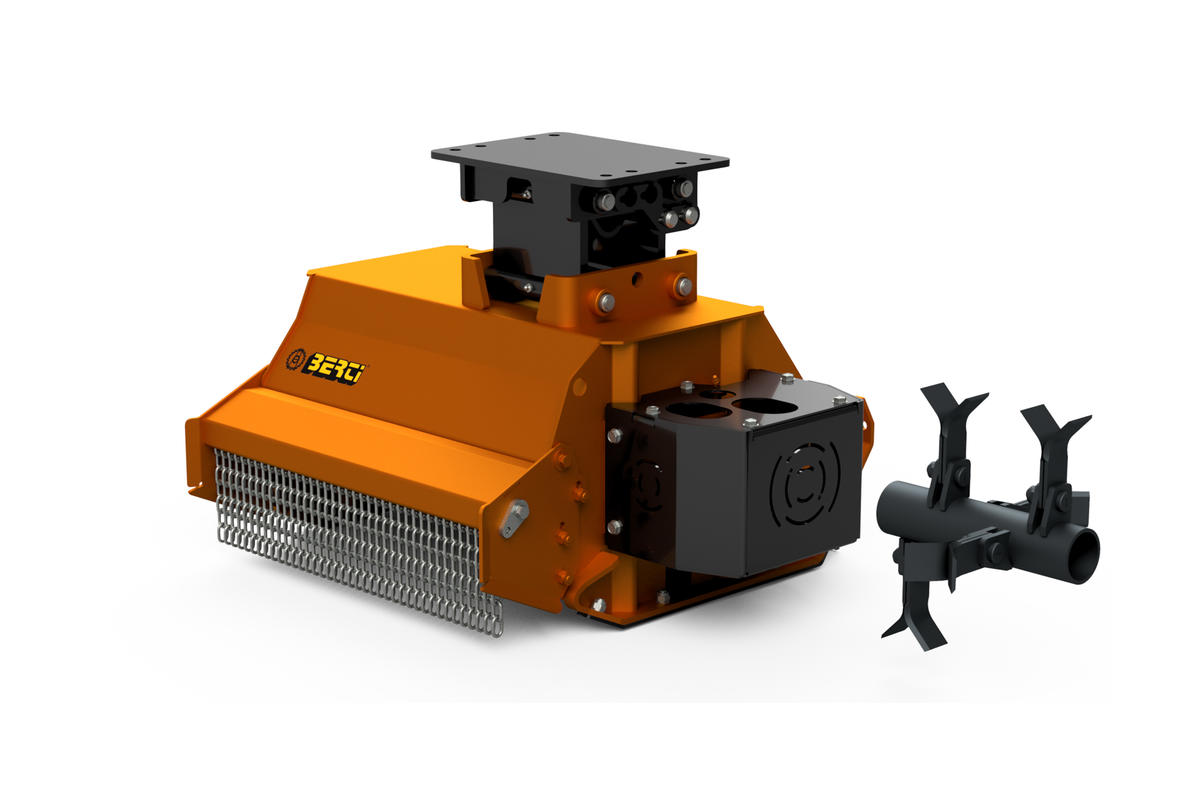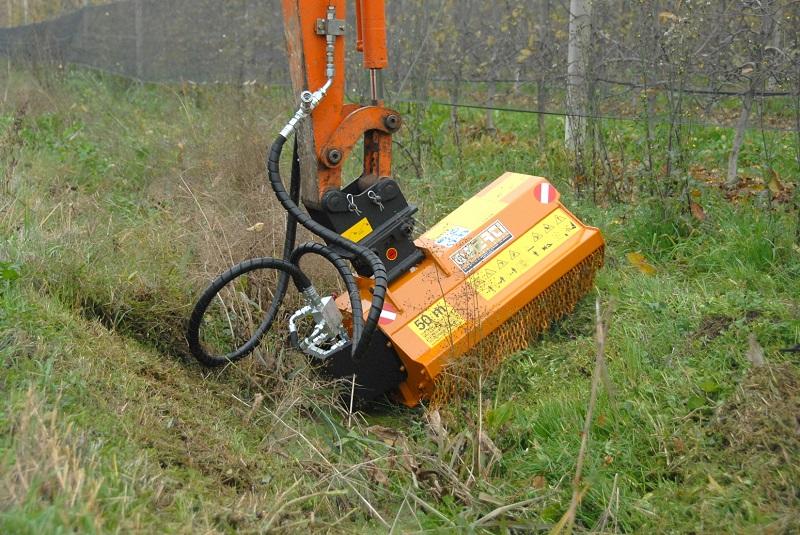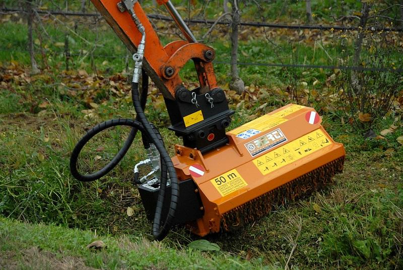 Trincia per miniescavatore, con peso operativo compreso fra 20 e 40 quintali, adatta a trinciare erba e piccoli rovi e arbusti fino a Ø 3 cm.