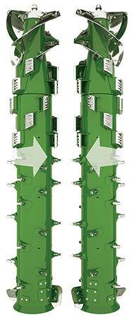 | UN NUOVO LIVELLO DI EFFICIENZA: L’azionamento dei due rotori richiede molta meno potenza. Dati chiave: 270° CARICAMENTO COMPLETO, 4.0 m² SUPERFICIE DI TREBBIATURA (calcolata come 2,5 x 1,6 m²), 22.5 m² SUPERFICIE DI SEPARAZIONE. |