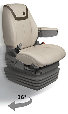 | COMFORT E CONTROLLO: Vasta cabina con vetri panoramici e montanti sottili. Estremamente silenziosa. Sedile Ultimate con funzione massaggio e climatizzazione avanzata. |