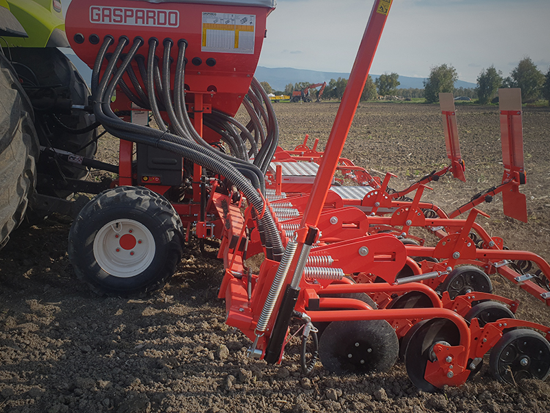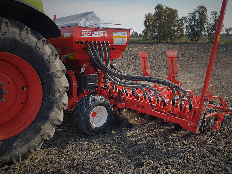 Il rinomato sistema di trasmissione GASPARDO con **cambio a tre camme in bagno d’olio** lavora in combinata con il trasporto pneumatico del seme. Tale sistema si avvale del brevetto **BY-PASS** che permette di aumentare sensibilmente la velocità di avanzamento. È disponibile a richiesta il sistema di **interruzione elettrica di semina** per voltate di fine campo.