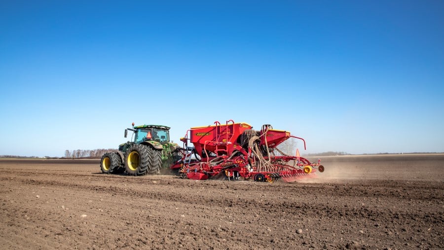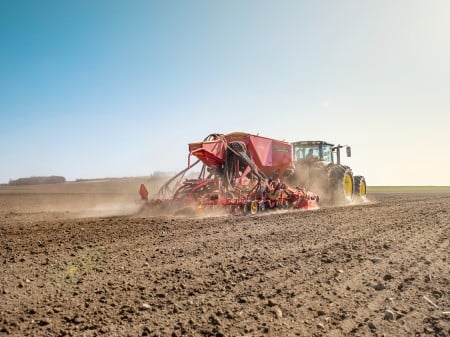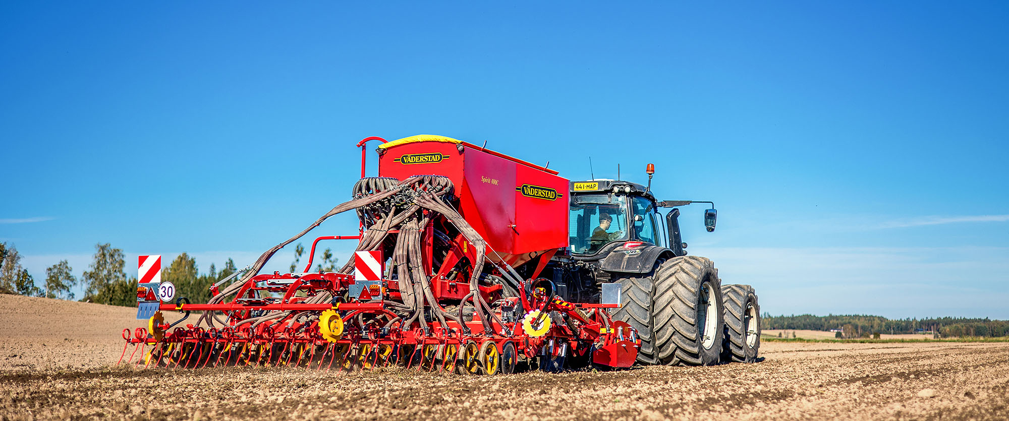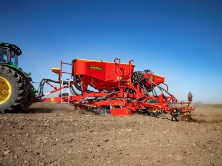 Precisione ed affidabilità La Spirit 400 è una seminatrice pneumatica da 4 metri di lavoro, disponibile in versione solo semina Spirit 400S o in versione combi Spirit 400C. Il telaio robusto garantisce lunga durata, mentre la precisa alimentazione del seme e la capiente tramoggia assicurano risultati eccellenti con tempi morti in campo ridotti al minimo. Elevata precisione di semina e alimentazione del concime Il sistema Fenix II combina alta precisione con grande capacità. La versione combi Spirit 400C distribuisce seme e concime tramite due sistemi separati Fenix II, funzionanti con robusto motorino elettrico fino a 500 kg di concime per ettaro a 15 km/h. Grande capacità della tramoggia Tramoggia da 3.740 litri per la versione solo semina e 5.000 litri per la versione combi. Facile da riempire grazie all’ampia apertura con telo azionato da terra. Tutti i componenti sono facilmente accessibili. Pressione attiva dei coltri Sistema attivo sui coltri per assicurare profondità costante anche su terreni collinari. Sensori idraulici rilevano sopraelevazioni o avvallamenti, e le valvole automatiche compensano aumentando o riducendo la pressione, mantenendo valore costante e uniformità di semina. Sempre una distribuzione corretta Testate di distribuzione poste in posizione sopraelevata, garantendo perfetto angolo dei tubi di semina anche in terreni inclinati e distribuzione uniforme sull’intera larghezza. Gestione automatica delle testate Il controllo di sequenza automatica solleva o abbassa le zone di lavoro una alla volta. Gli attrezzi frontali vengono abbassati prima dei coltri e dell’erpice posteriore, ottimizzando la precisione sulle testate. Controllo completo con Väderstad SeedEye Sistema unico per conta del seme e monitoraggio della semina. Permette di impostare facilmente il numero di semi per metro quadrato senza taratura, garantendo risultati eccellenti. Due tecniche di deposizione del concime – FIX Coltri frontali che depositano concime su bande larghe 5 cm a distanza di 125 mm tra le file. Profondità regolabile dalla cabina. Disponibile con larghezze di lavoro di 6, 8 e 9 metri. Moderno sistema di controllo Sistema E-Control gestito tramite iPad. Regola in campo profondità del sistema frontale, coltri di semina e erpice idraulico posteriore. Meno passaggi con BioDrill Tramoggia per semi minuti BioDrill permette semina di cover crop o loietto assieme alla coltura principale. Distribuzione uniforme del seme davanti ai coltri, precisione e risparmio di passaggi. Dati tecnici