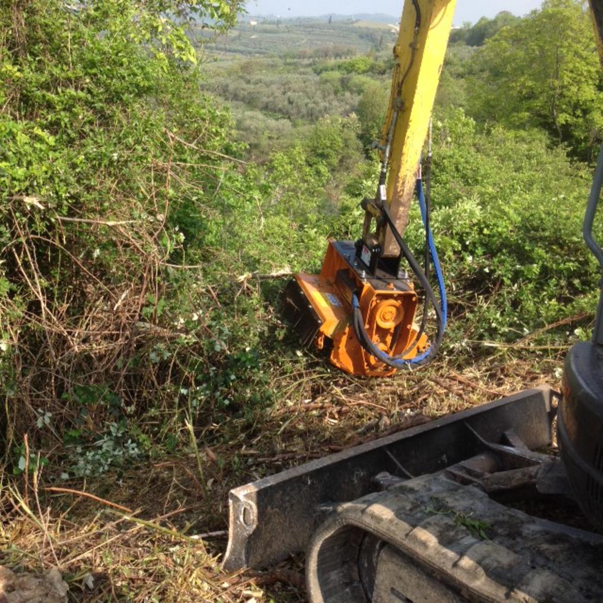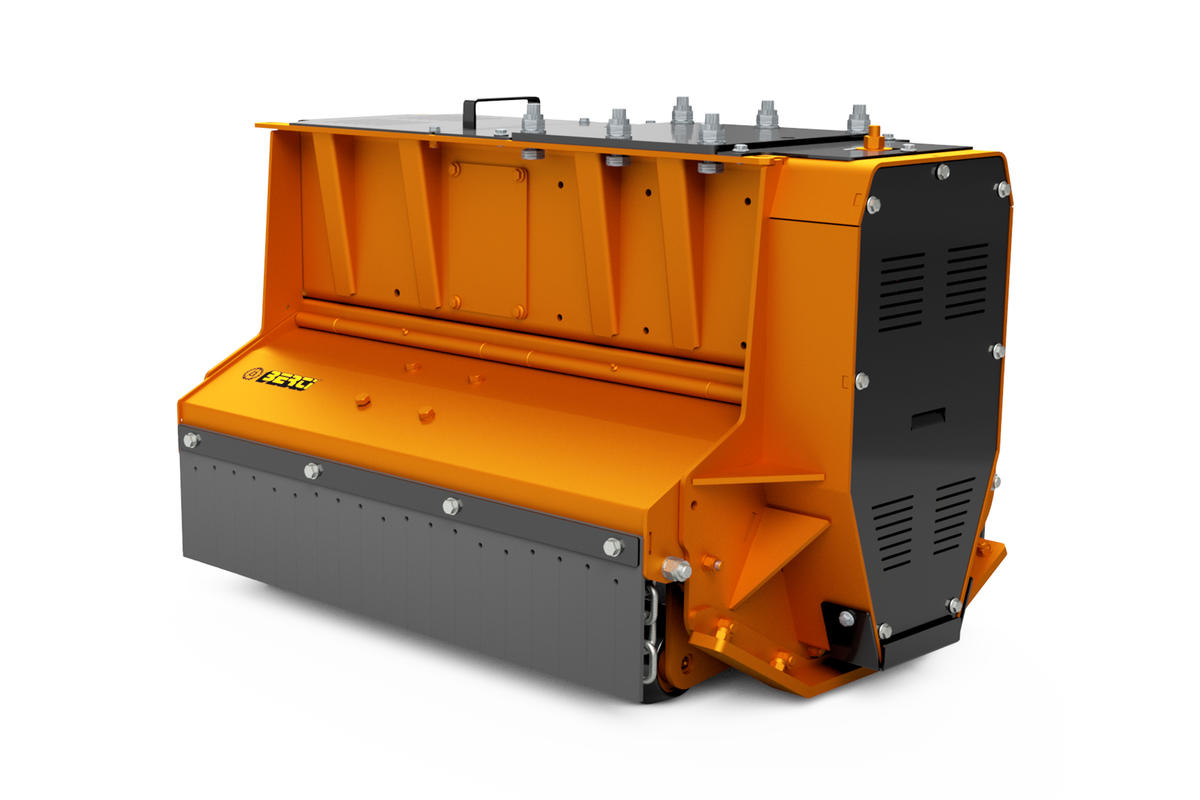 Trincia forestale con rotore a utensili fissi per escavatore con peso operativo da 70 a 110 quintali. Adatta alla trinciatura di erba, cespugli ed arbusti fino a Ø 12 cm. Equippaggiata con motore a pistoni a cilindrata variabile automatica.