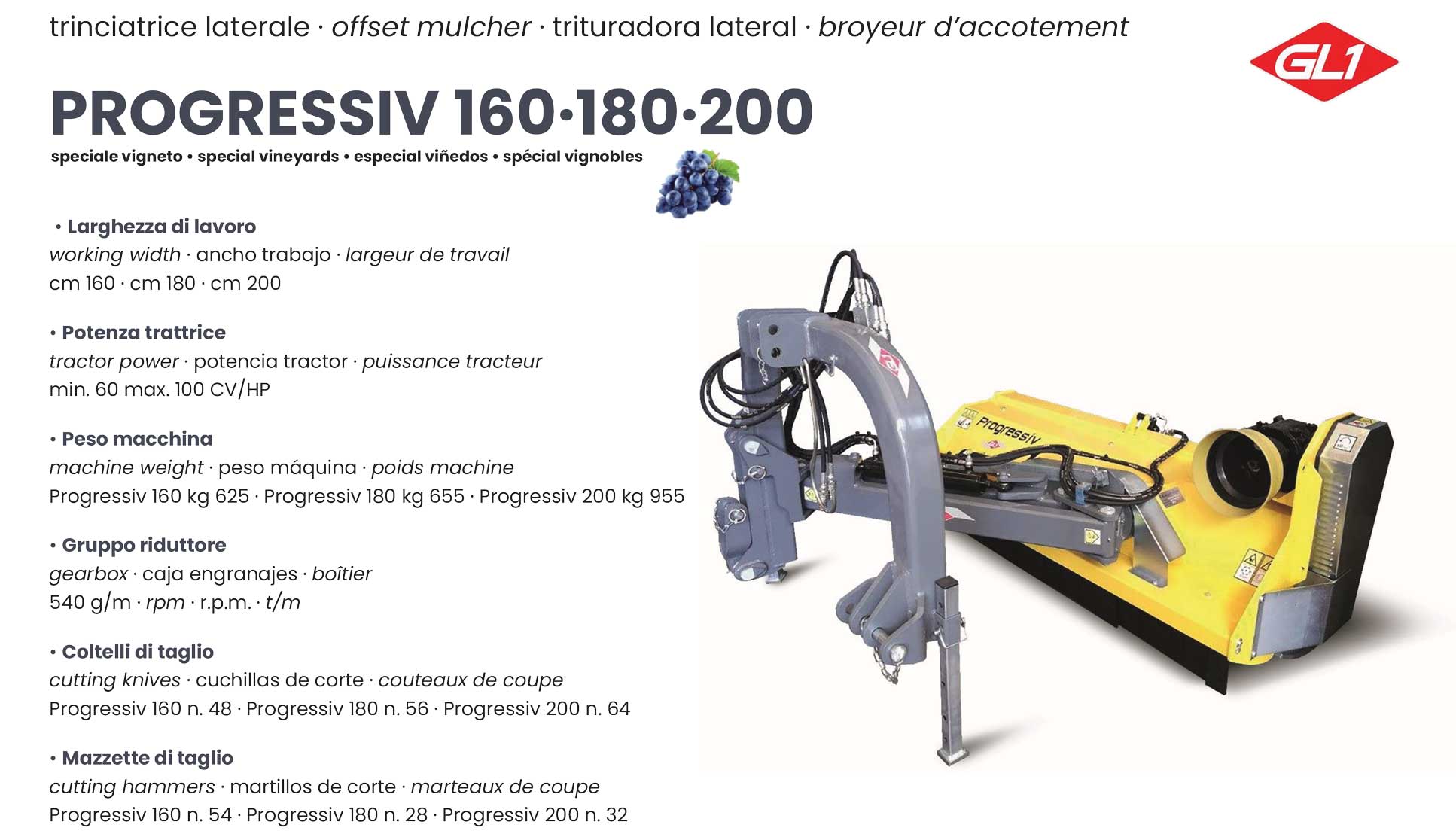 Trattori con potenza da/a: 60 ÷ 100 CV Larghezza di taglio: 164 – 184 – 200 CM Peso: 625 – 655 – 695 KG |