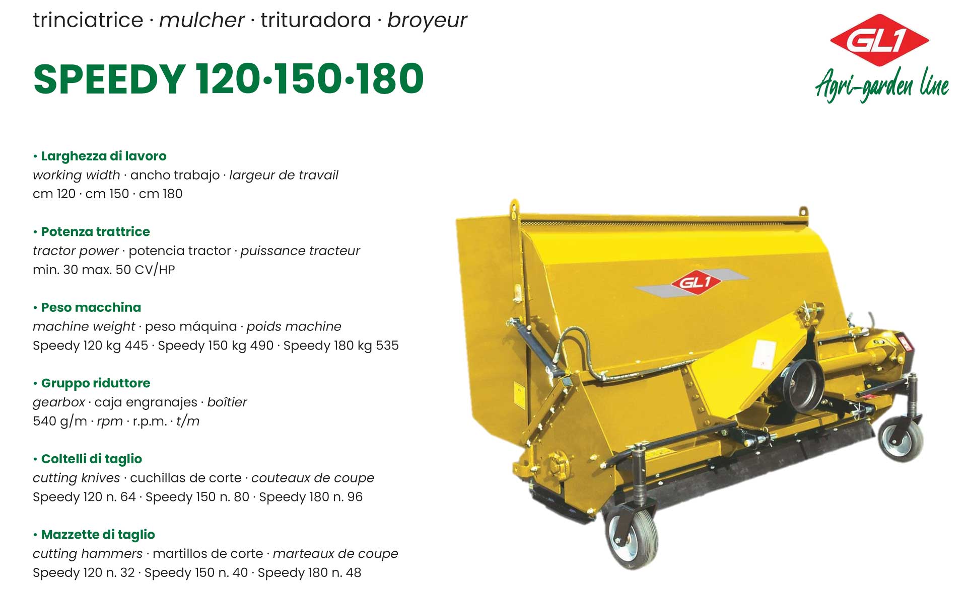 Trattori con potenza da/a: 30 ÷ 50 CV Larghezza di taglio: 120 – 150 – 180 CM Peso: 445 – 490 – 535 KG Gruppo riduttore: 540 g/m Coltelli di taglio: