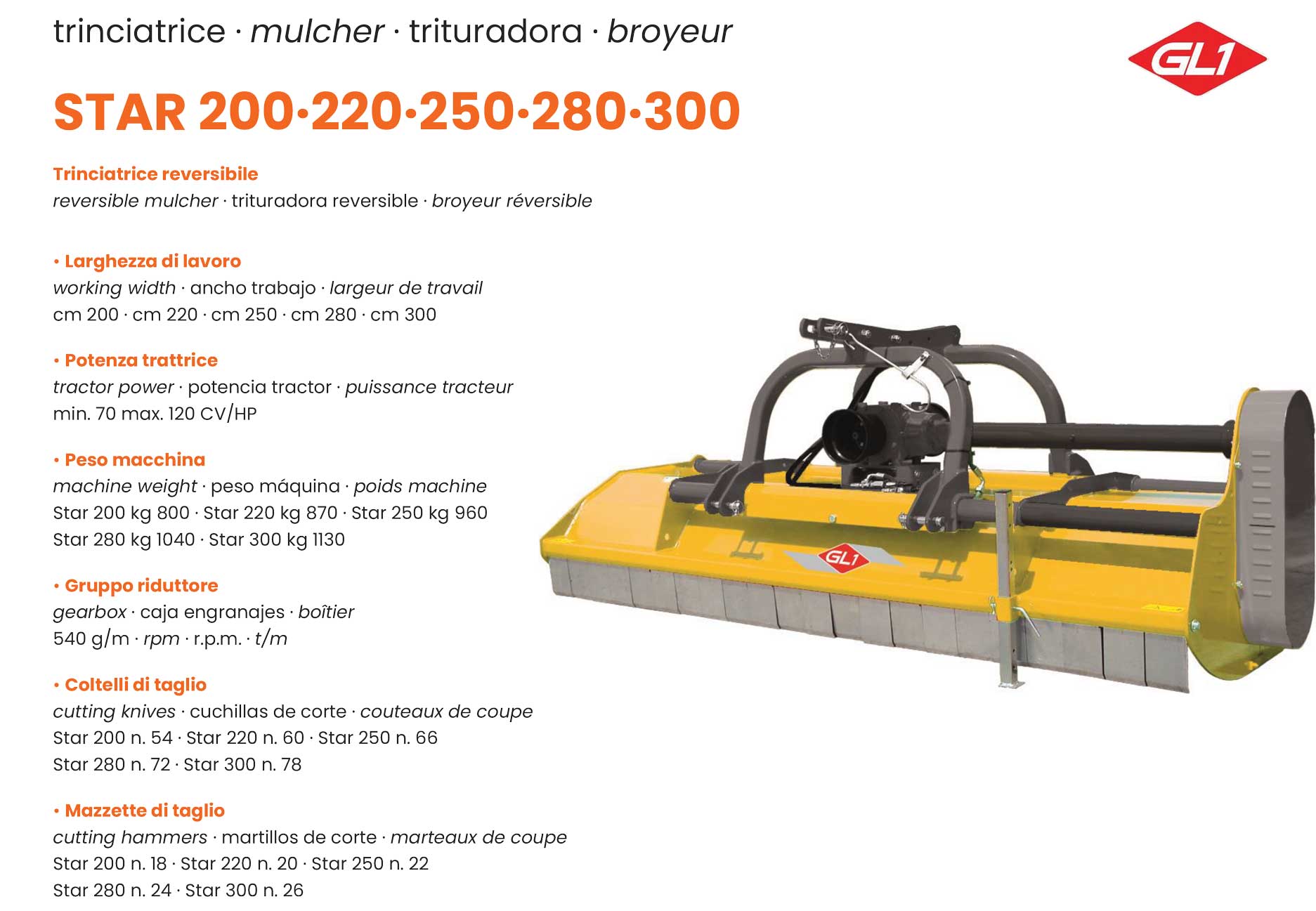 Trattori con potenza da/a: 70 ÷ 120 CV Larghezza di taglio: 200 – 220 – 250 – 280 – 300 CM Peso: 800 – 870 – 960 – 1040 – 1130 KG |