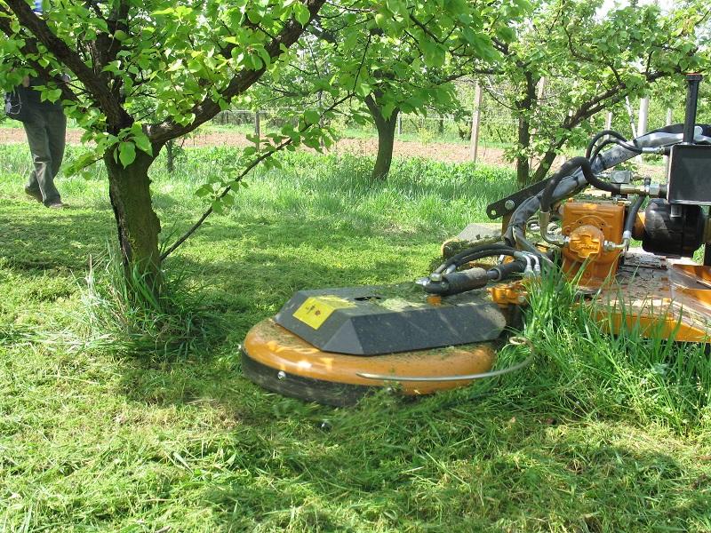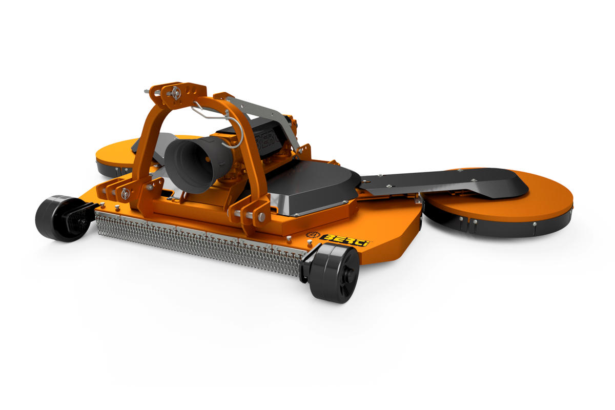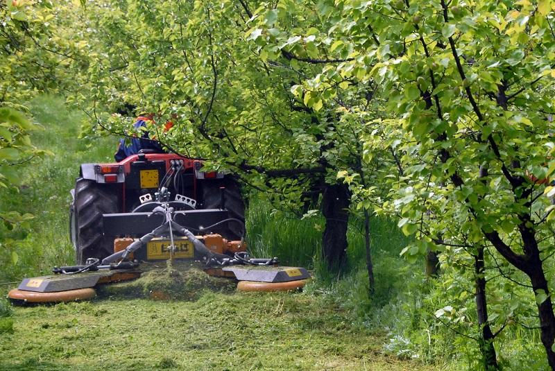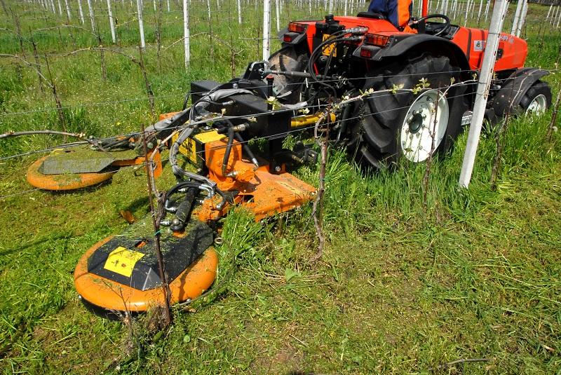 Falciatrice a larghezza variabile per erba, di tipo portato per l'impiego agricolo su vigneti e frutteti in genere, da applicare su trattori con potenza compresa tra 30 e 120 HP. La larghezza di lavoro variabile, regolabile idraulicamente, è dotata di due valvole di massima anti-urto che permettono di lavorare in tranquillità in filari di qualsiasi larghezza. La trasmissione è meccanica, composta da tre scatole ad ingranaggi che, tramite **cinghie trapezoidali ad alta resistenza**, trasmettono il moto ai coltelli di tipo snodato e garantiscono un taglio perfetto grazie alla massima intersecazione e contro rotazione dei rotori. Nelle coltivazioni biologiche, è possibile abbinare alla macchina due tastatori idraulici sui rotori interfilari (accessorio), per evitare il danneggiamento della pianta stessa al momento del passaggio. |