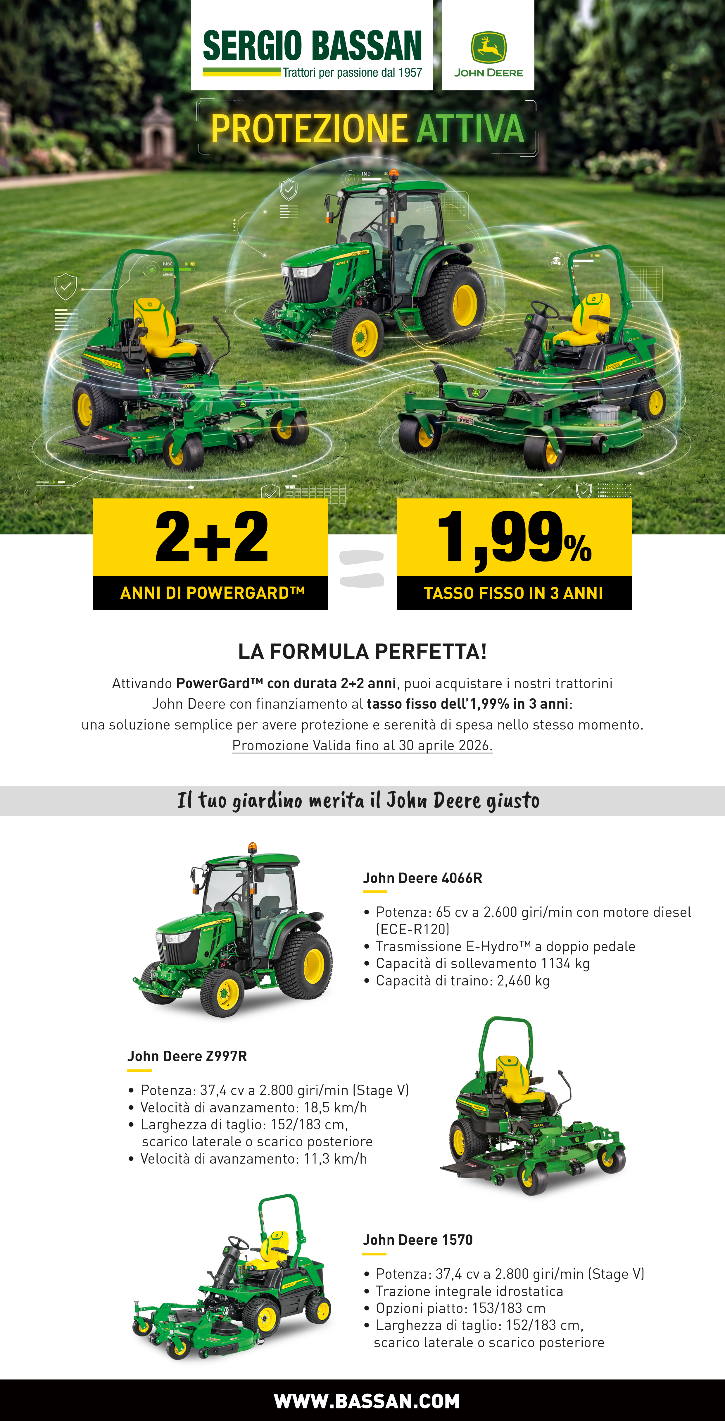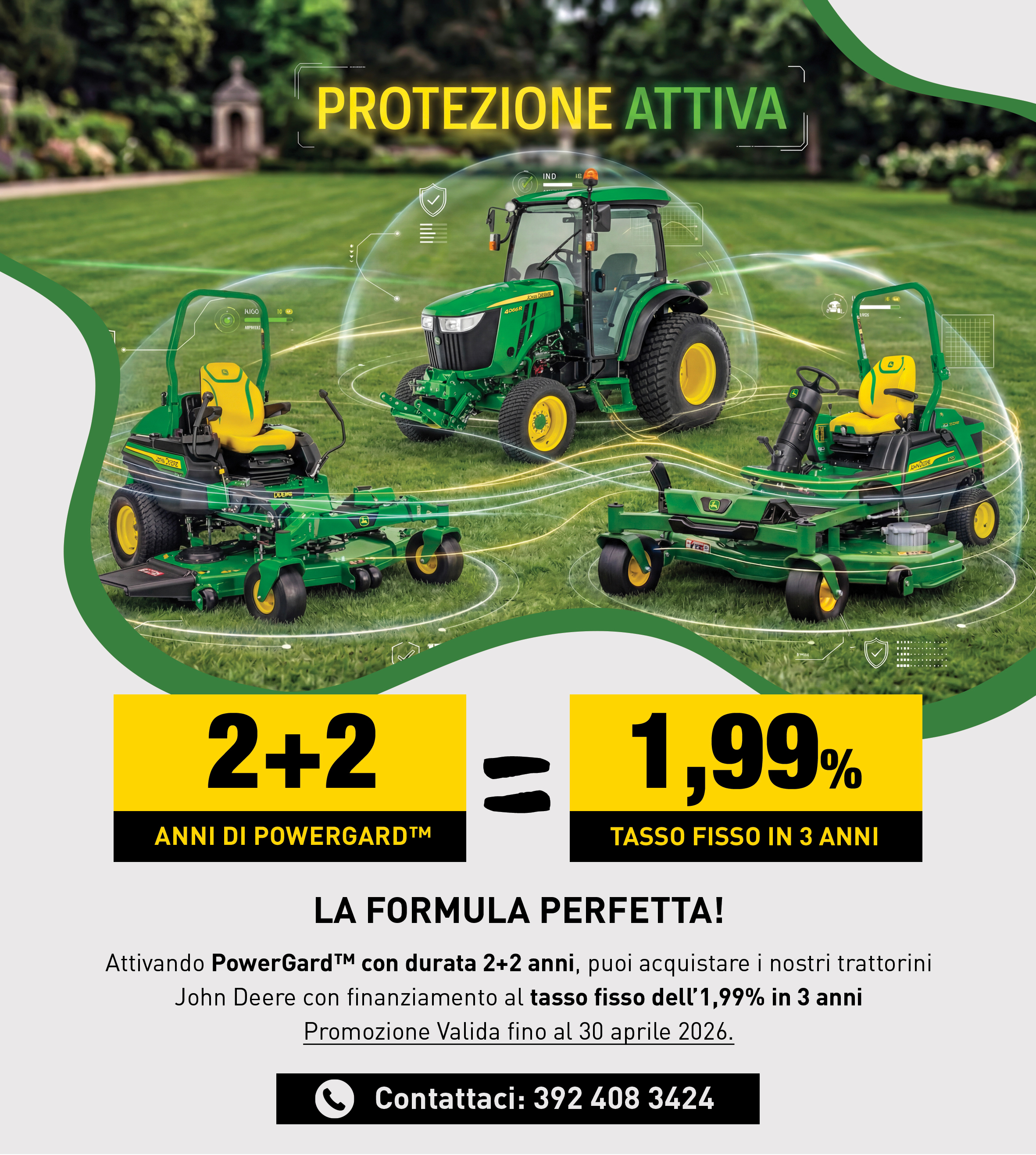 Attiva PowerGard™ 2+2 anni e porta a casa il tuo trattorino con un finanziamento al tasso fisso dell’1,99% in 3 anni.